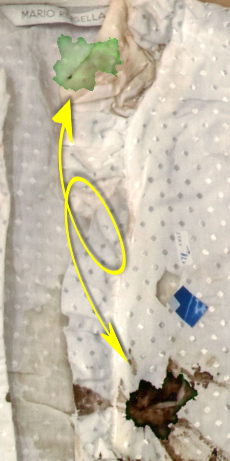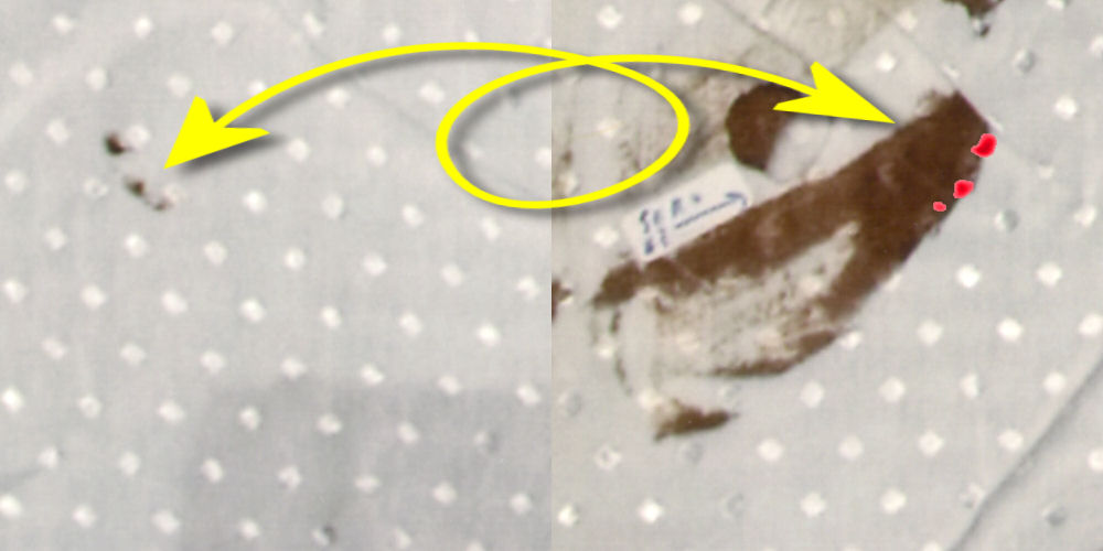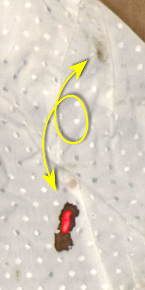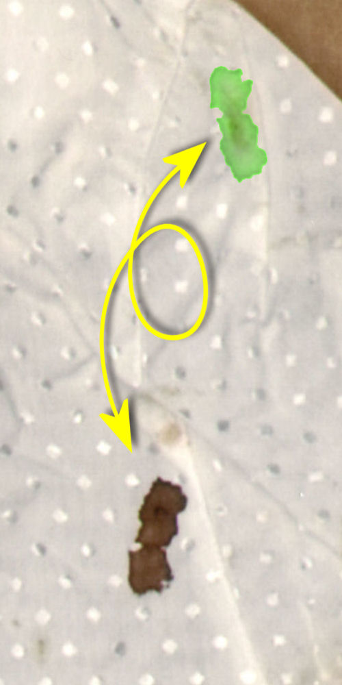 Op de plaats delict vielen bepaalde details in de plooien van de blouse. Op de foto van de blouse bij het NFI zijn die plooien platgestreken en werden reeds aanwezige vlekken beter zichtbaar, weergegeven in geel. Maar ook ontstonden er intussen nieuwe vlekken - zichtbaar door het bestuderen van de linker afbeelding en een aanvullende afbeelding van de blouse op de plaats delict hier meteen volgend. Deze vlekken zijn weergegeven in rood. Uit deze vlekken ontstonden volgens analyses hierboven en hieronder weer nieuwe vlekken, doordat de blouse intussen werd dubbelgevouwen. | |