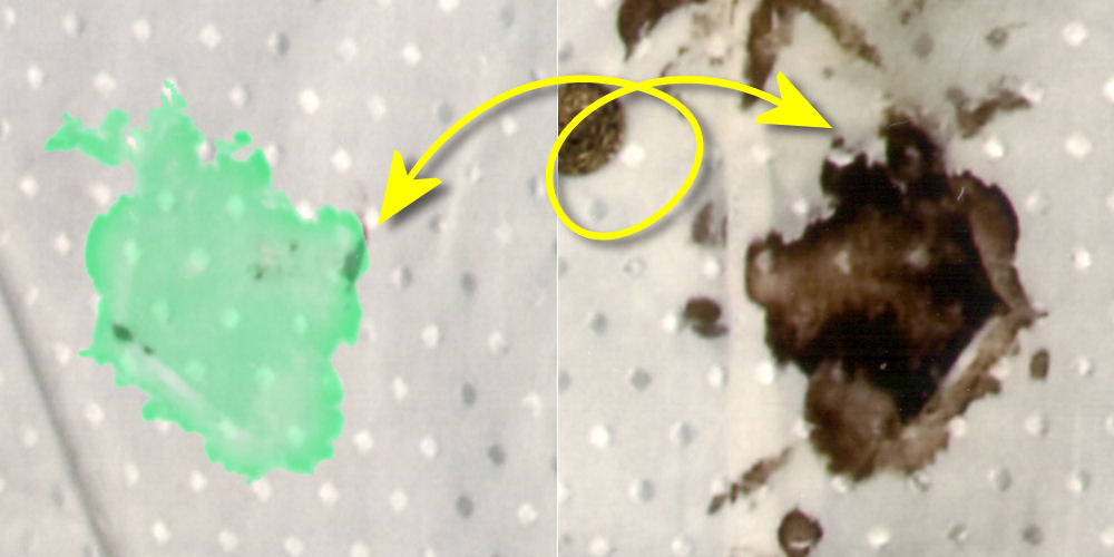 De blouse onder UV-lichtKlik en schuif; zoek de twee zgn. onderzochte vlekken. |