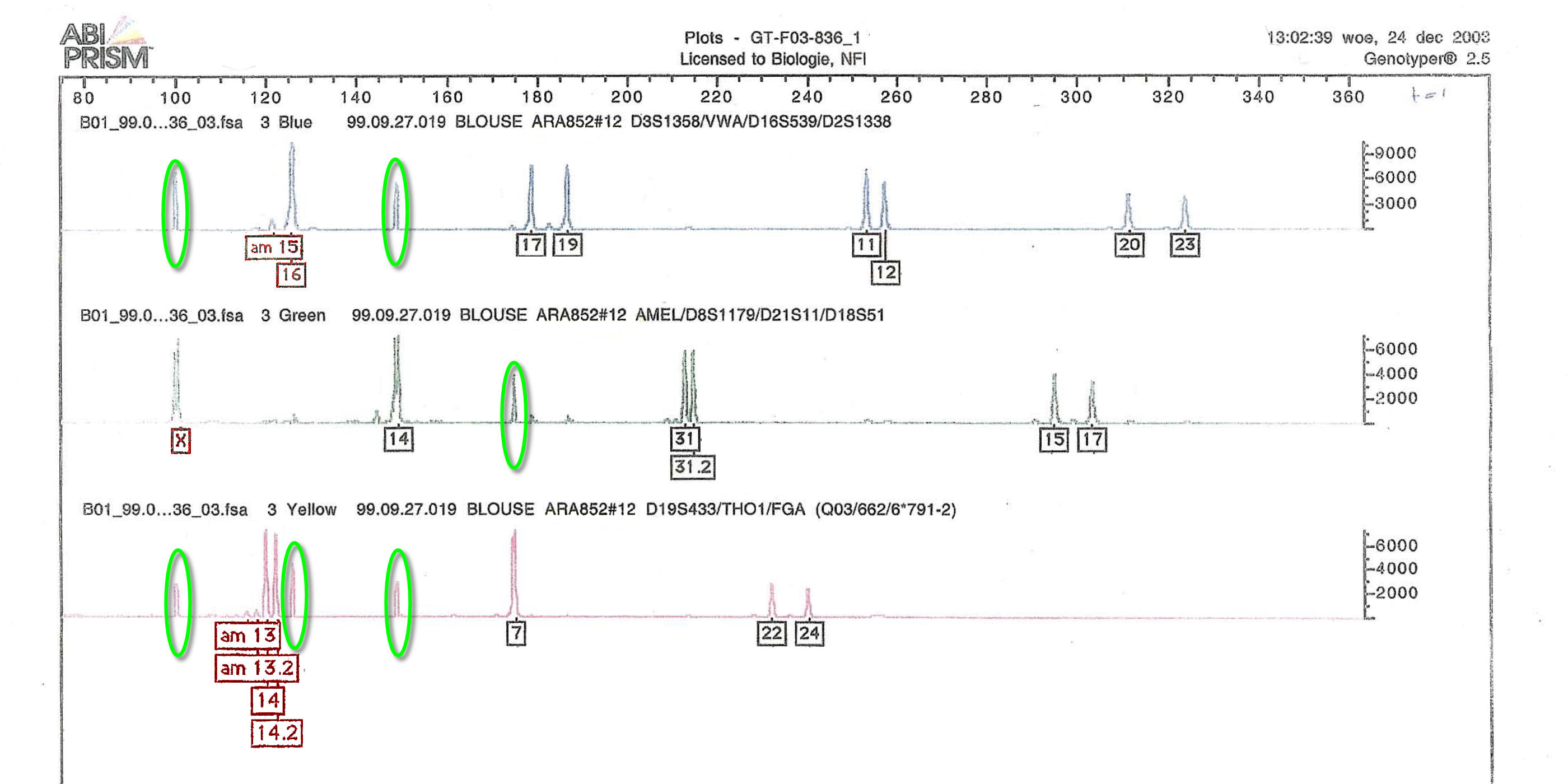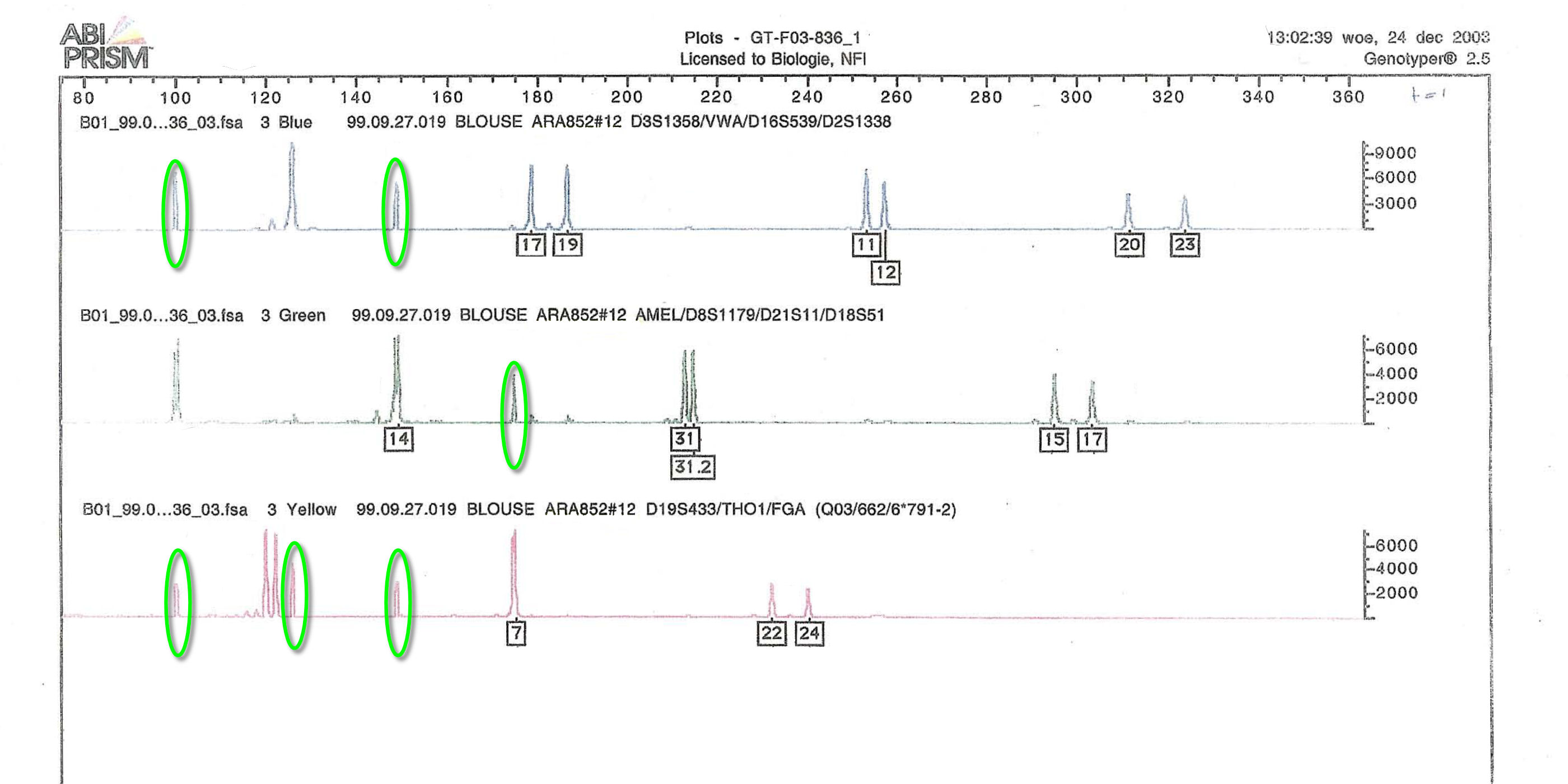 Waarom werden de spoor 07 en 12 niet onderzocht?Klik en schuif; de sporen #07 en #12 werden ten onrechte als partiële profilelen geregistreerd omdat de software een aantal pieken niet herkende.![]() |