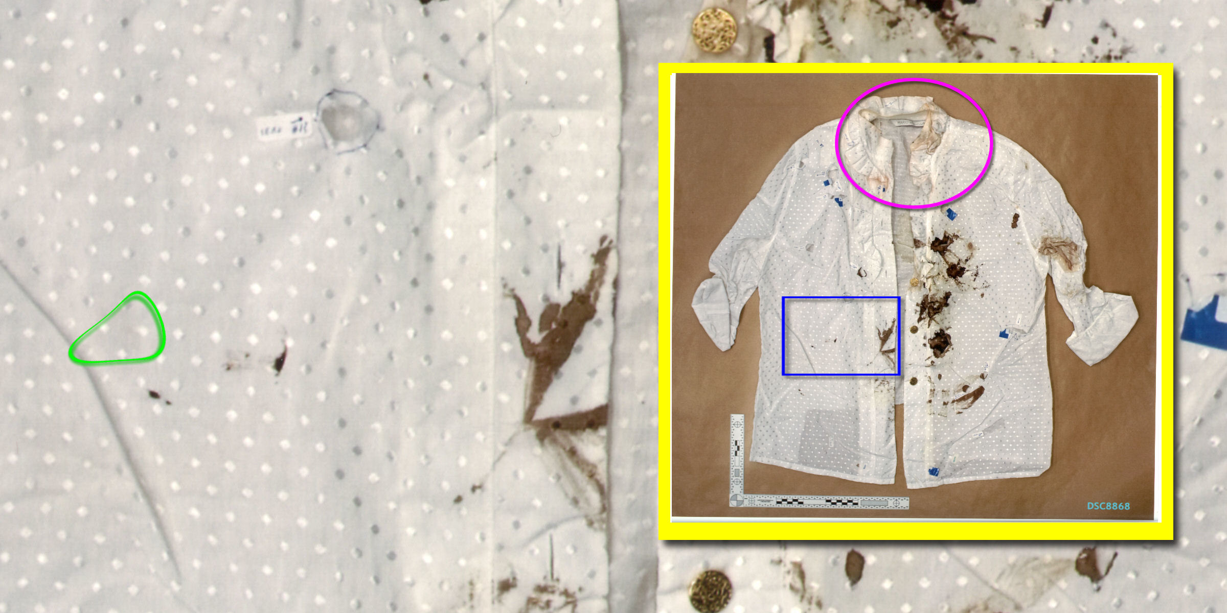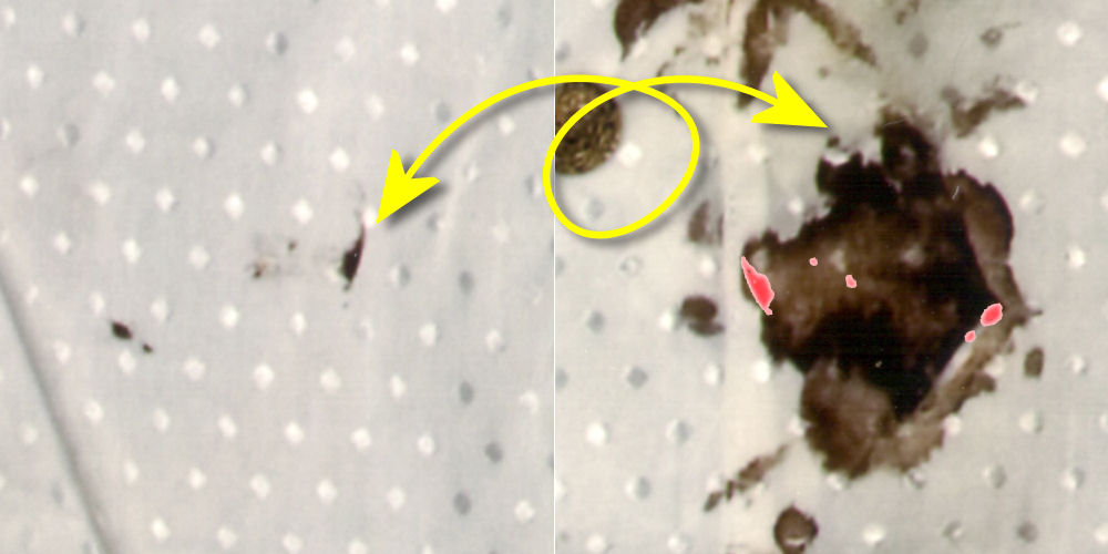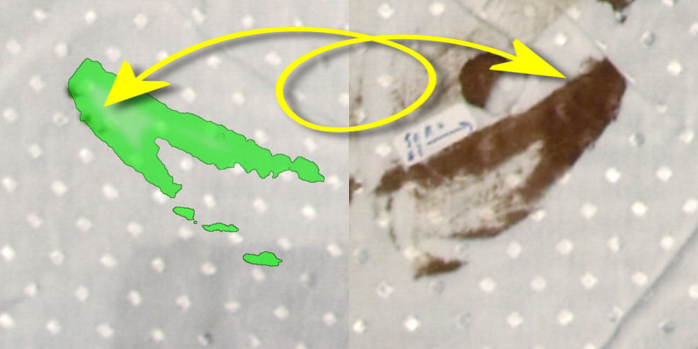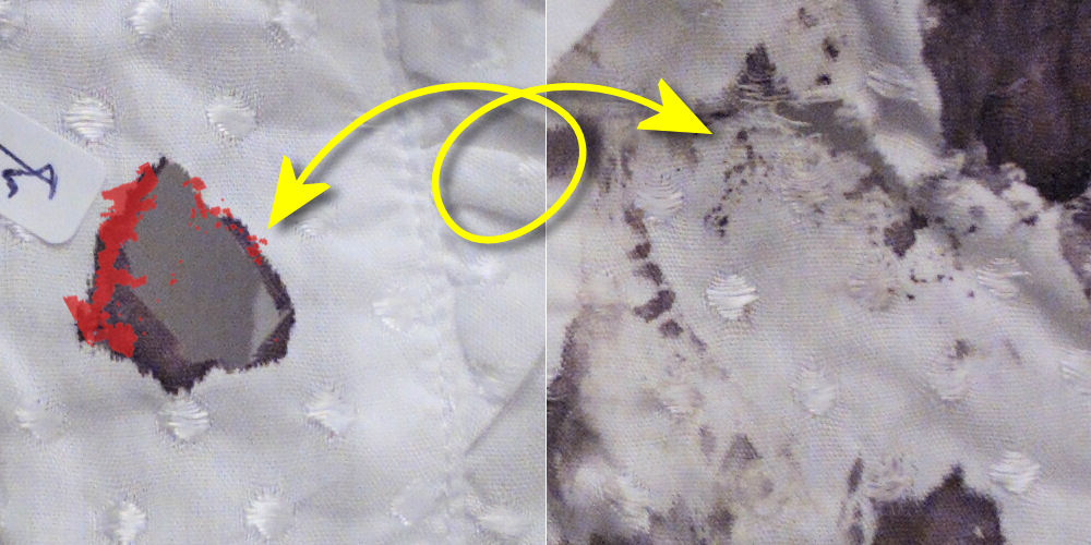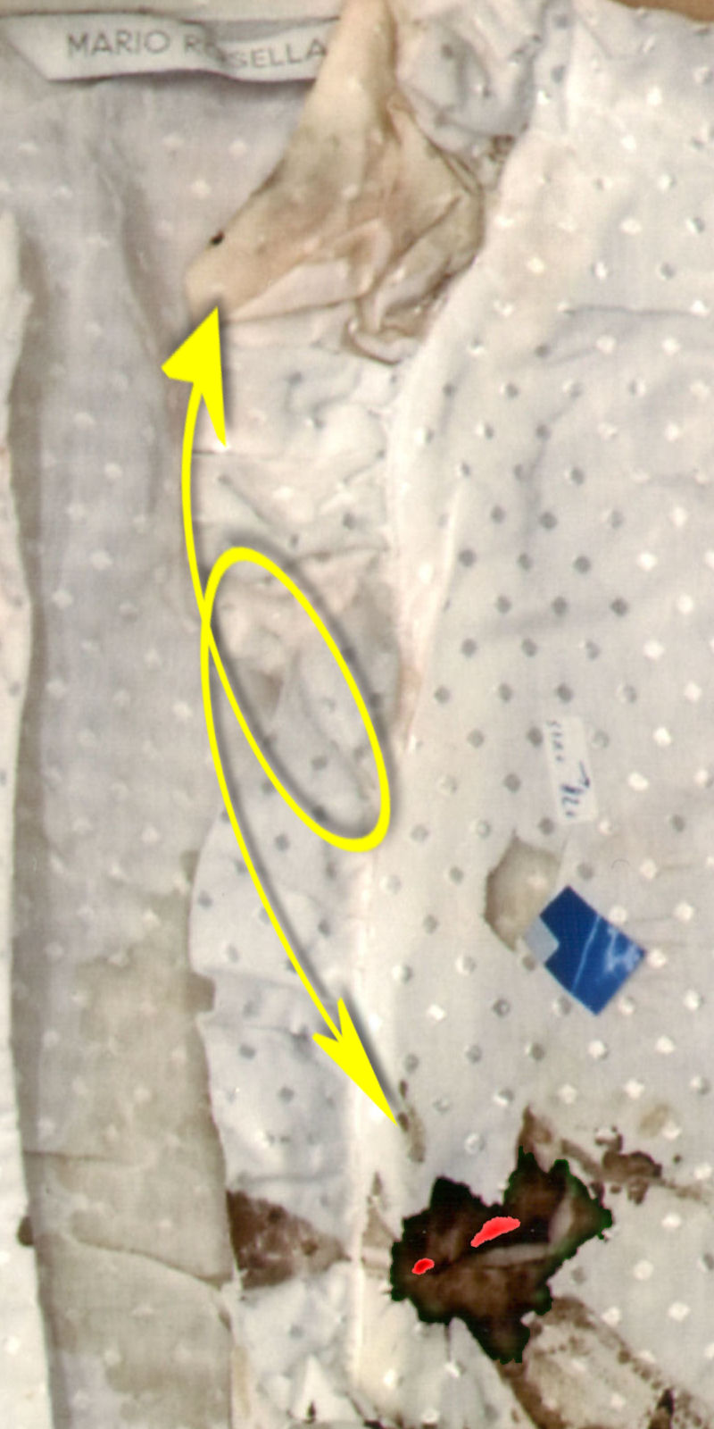 Op de plaats delict vielen bepaalde details in de plooien van de blouse. Op de foto van de blouse bij het NFI zijn die plooien platgestreken en werden reeds aanwezige vlekken beter zichtbaar, weergegeven in geel. Maar ook ontstonden er intussen nieuwe vlekken - zichtbaar door het bestuderen van de linker afbeelding en een aanvullende afbeelding van de blouse op de plaats delict hier meteen volgend. Deze vlekken zijn weergegeven in rood. Uit deze vlekken ontstonden volgens analyses hierboven en hieronder weer nieuwe vlekken, doordat de blouse intussen werd dubbelgevouwen. | |