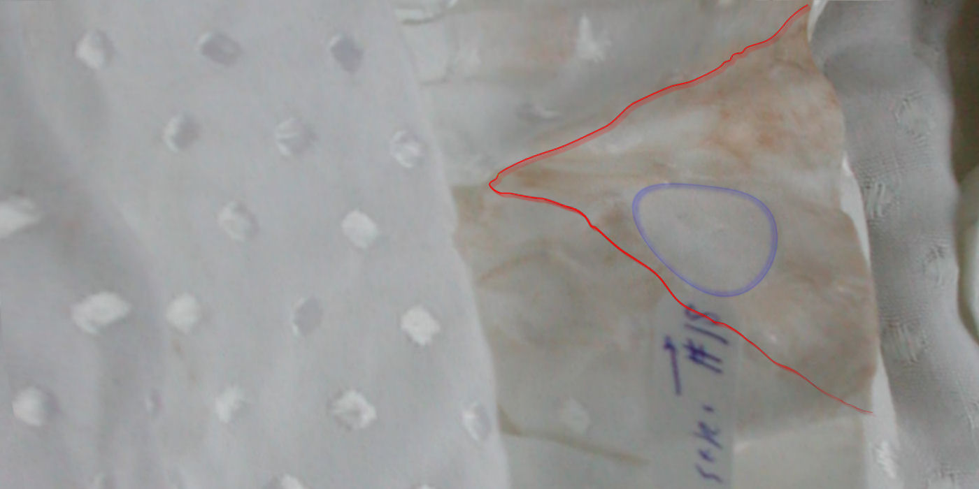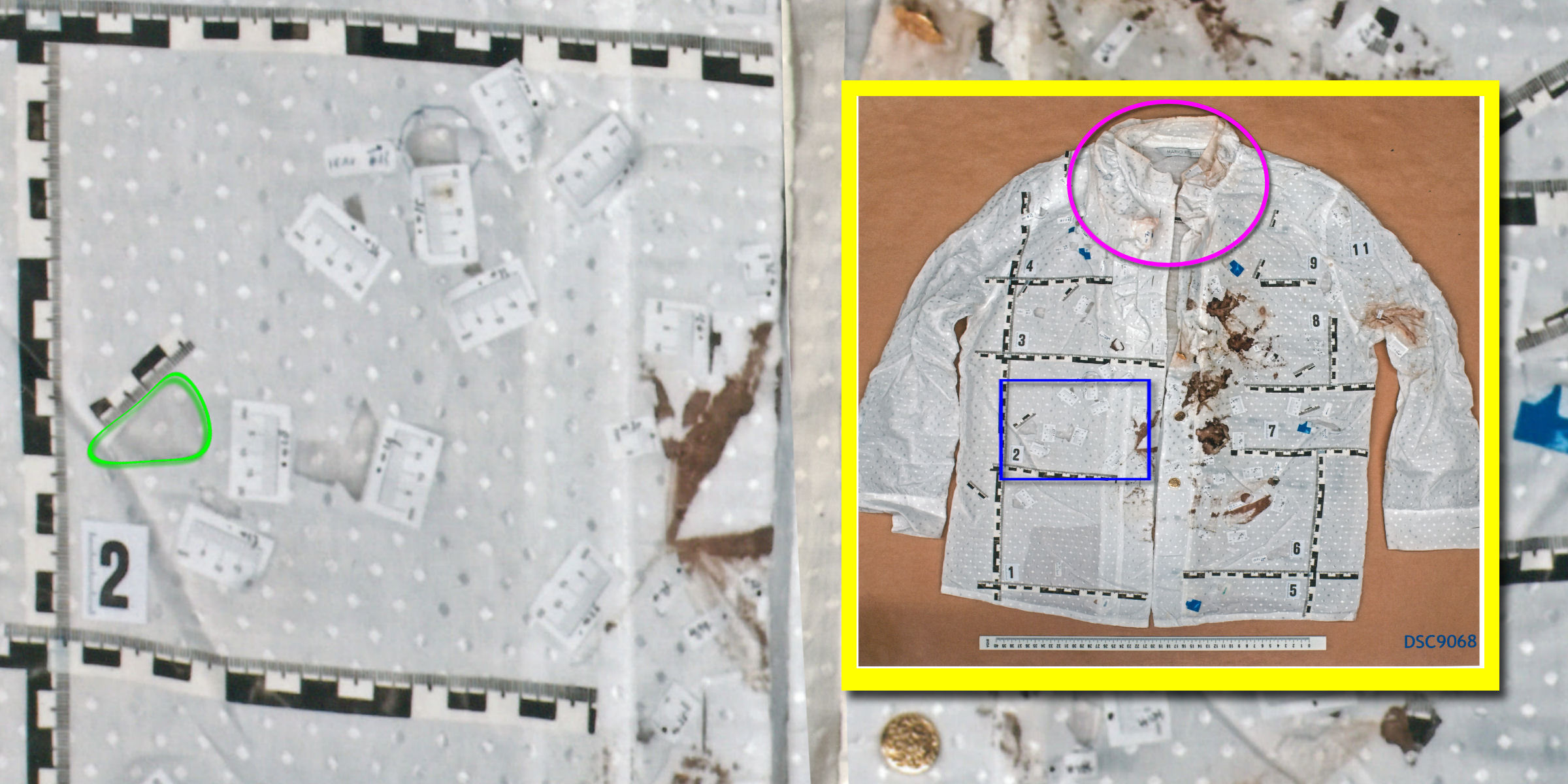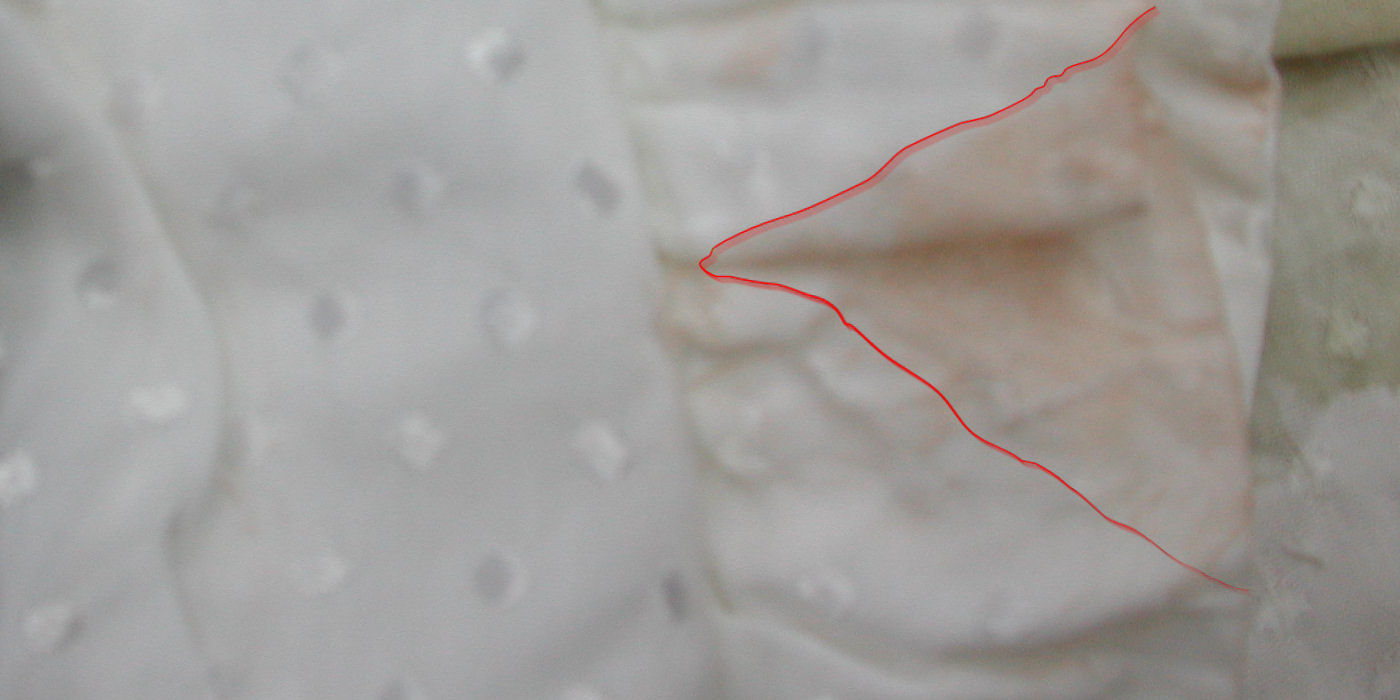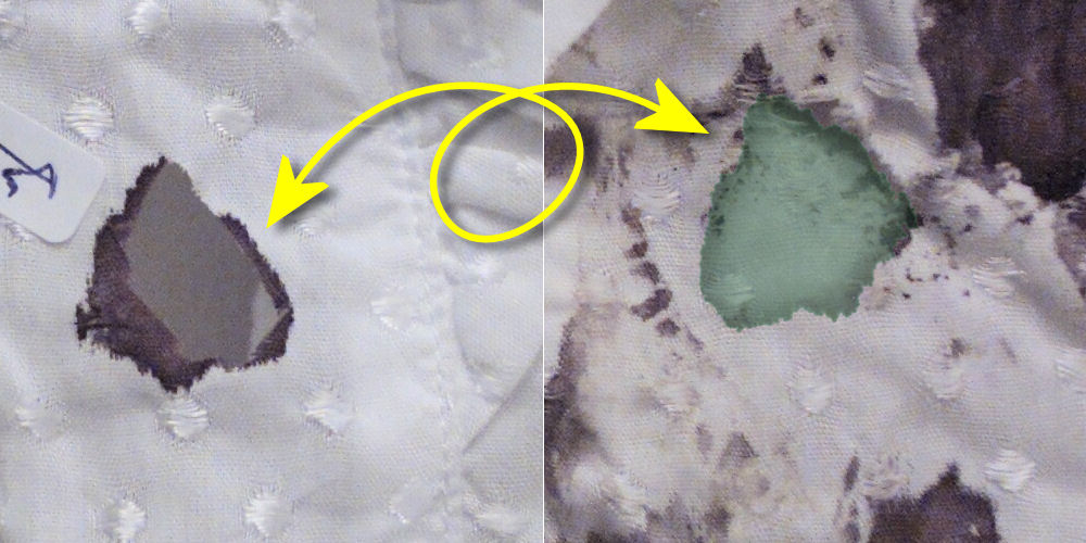 Op de plaats delict vielen bepaalde details in de plooien van de blouse. Op de foto van de blouse bij het NFI zijn die plooien platgestreken en werden reeds aanwezige vlekken beter zichtbaar, weergegeven in geel. Maar ook ontstonden er intussen nieuwe vlekken - zichtbaar door het bestuderen van de linker afbeelding en een aanvullende afbeelding van de blouse op de plaats delict hier meteen volgend. Deze vlekken zijn weergegeven in rood. Uit deze vlekken ontstonden volgens analyses hierboven en hieronder weer nieuwe vlekken, doordat de blouse intussen werd dubbelgevouwen. | |