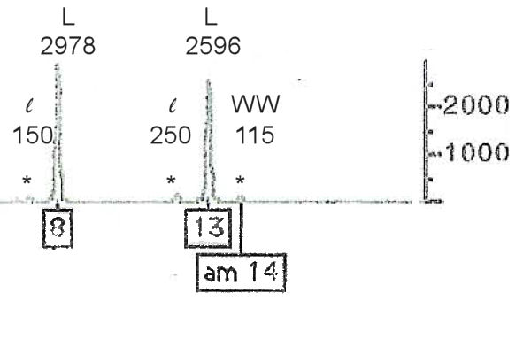 In dit locus zijn de beide bijdragen W11 en W12 nawijsbaar. W11 heeft de backward stutter l11 relatief verhoogd in waarde en boven de drempelwaarde getild. Tegelijkertijd heeft W12 de balans L12-L13 omgepoold. |