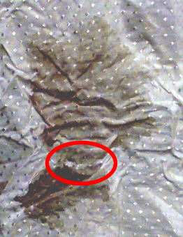 Overdracht van vochtspoor binnen de blouse. Let op het kleurverschil tussen de bron en de kopie. Kennelijk wordt een deel van de bron selectief gekopieerd. Dit is heel wel chemisch verklaarbaar. (appendix 3) |