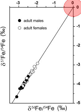 Afwijking in isotoop-verhoudingen bij ijzer. Rode vlek: mineraal ijzer. |